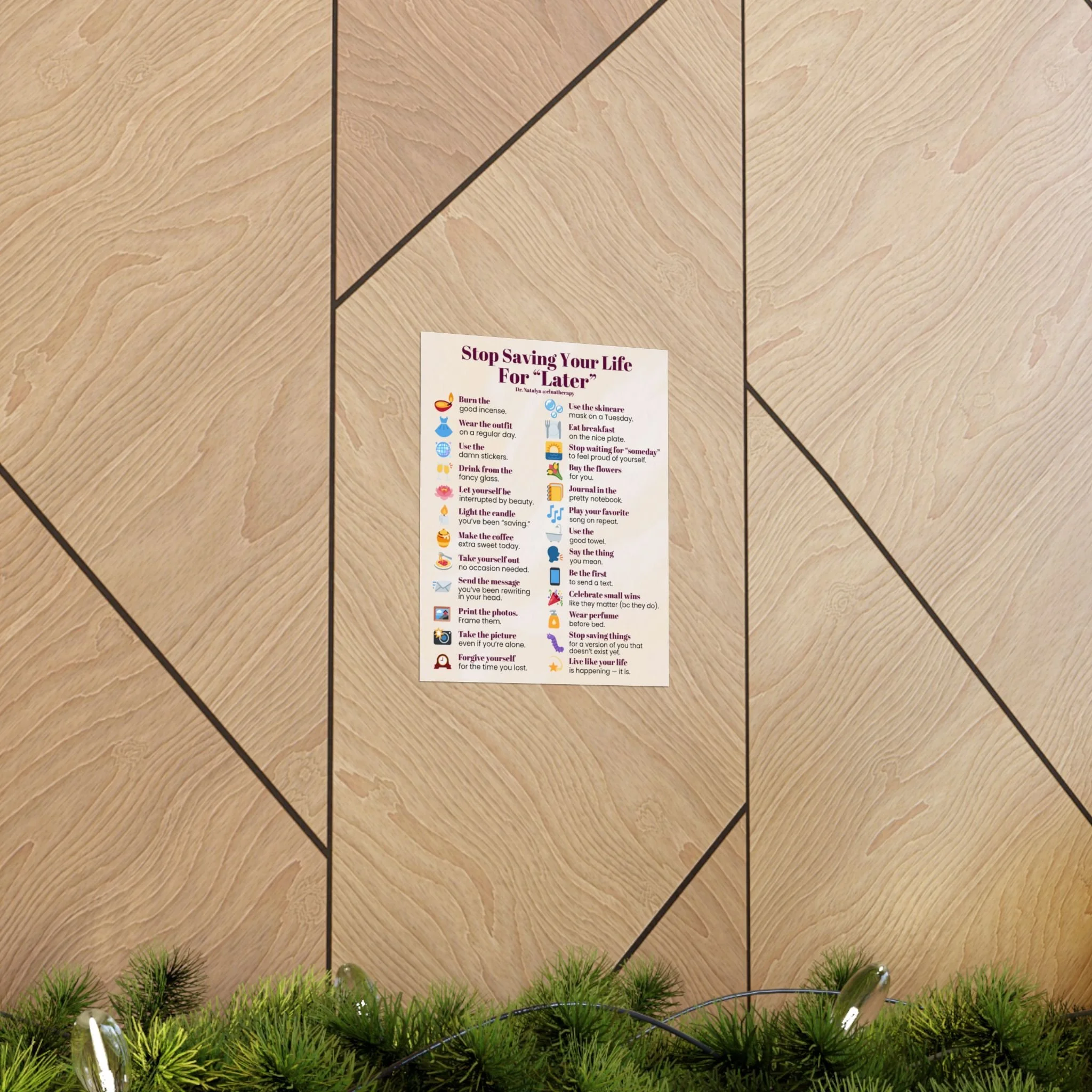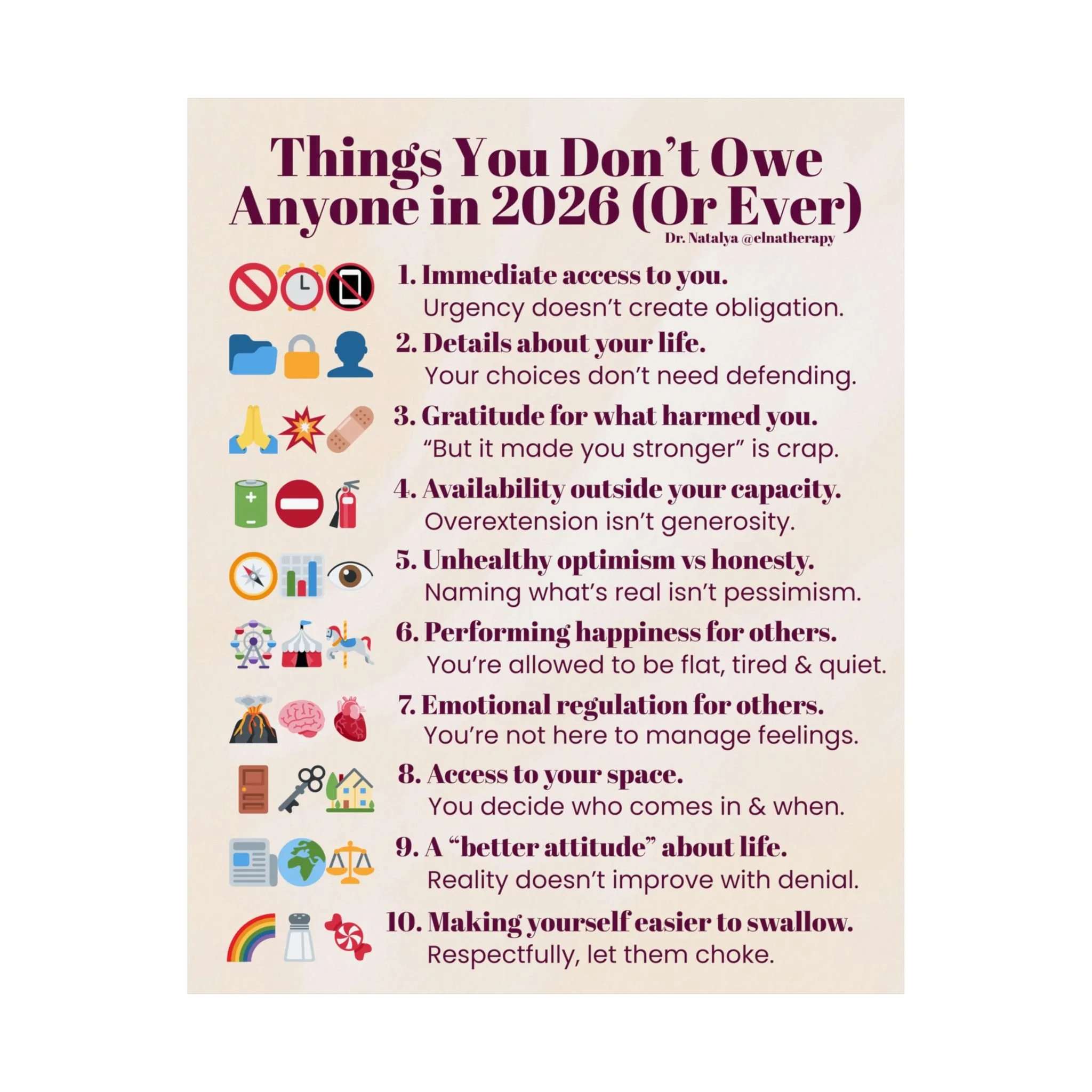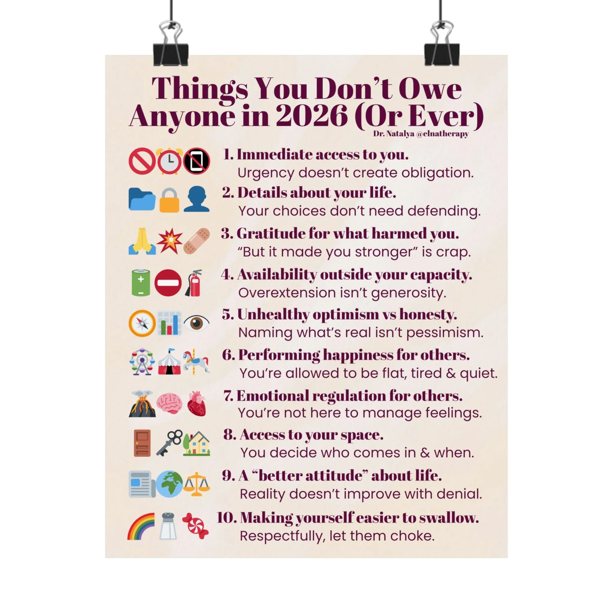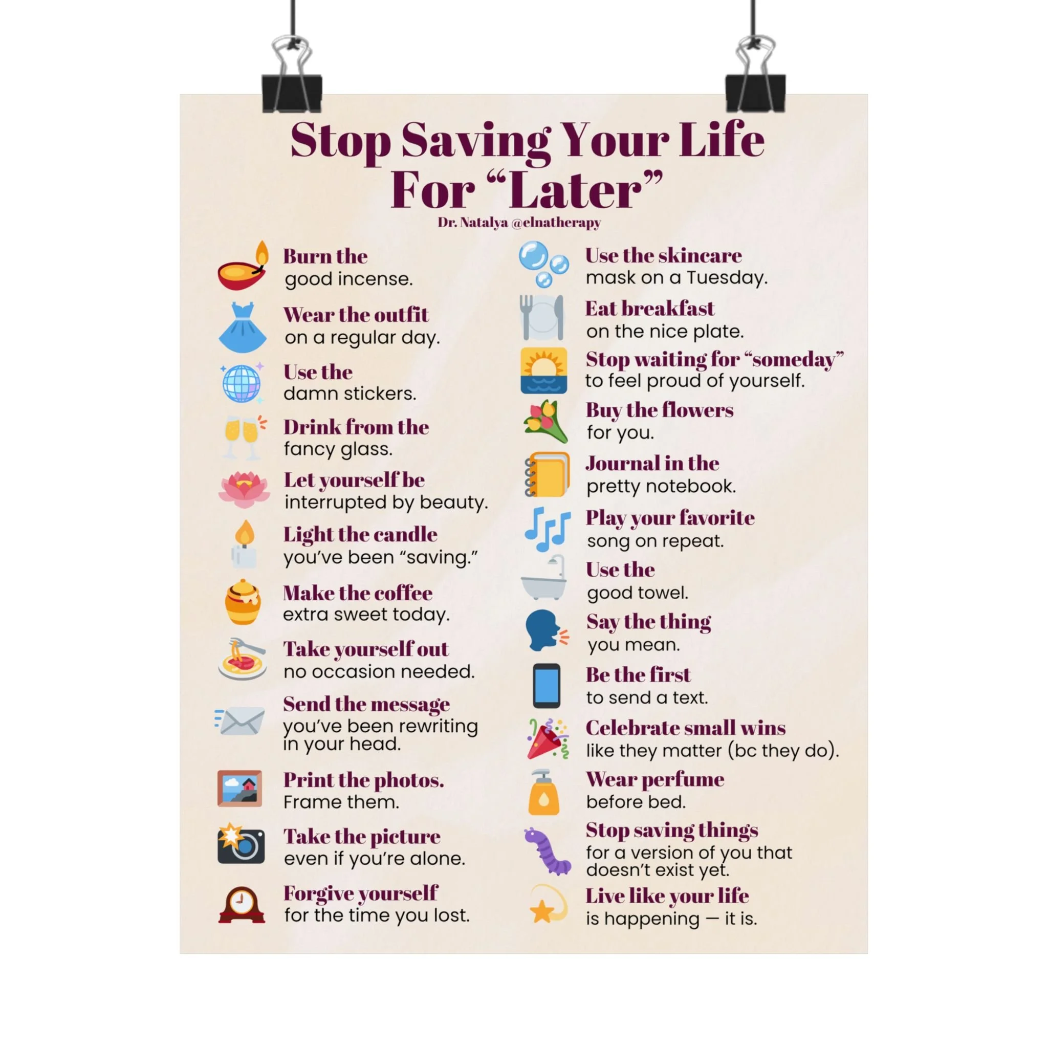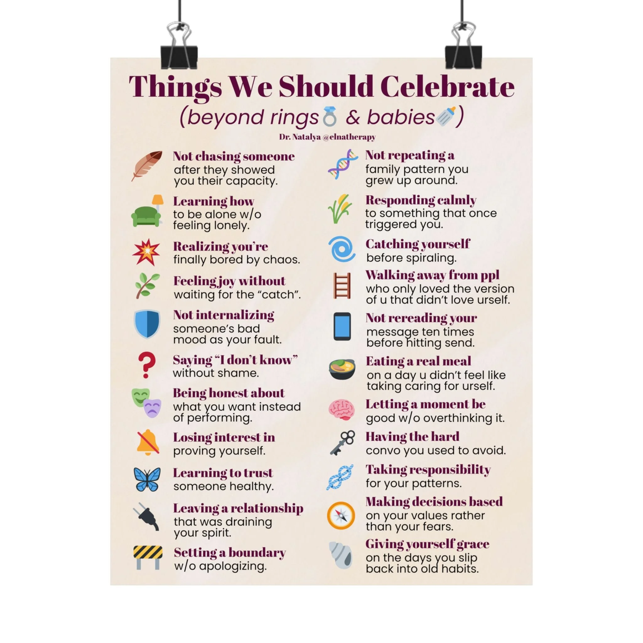 DR. NATALYA @ELNATHERAPY DR. NATALYA @ELNATHERAPY DR. NATALYA @ELNATHERAPY Store Categories: Select a Category Print Media Print Media | Couples Workbook Holiday Gift Bundle Sale Price: $84.99 Original Price: $89.99 Sale The 4 Seasons: Couples' Therapy Workbook $49.99 Self-Discovery: A Guided Journey $19.99 Things You Don't Owe Anyone in 2026 Matte Vertical Poster | Self-Care List Wall Art $24.99 Things to Get Rid of Before 2026 Matte Vertical Poster | Decluttering Checklist Wall Art $24.99 Stop Saving Your Life For 'Later' Matte Vertical Poster — Daily Self-Care Wall Art $24.99 Things We Should Celebrate (beyond rings & babies) Matte Vertical Poster | Inspirational Wall Art $13.82